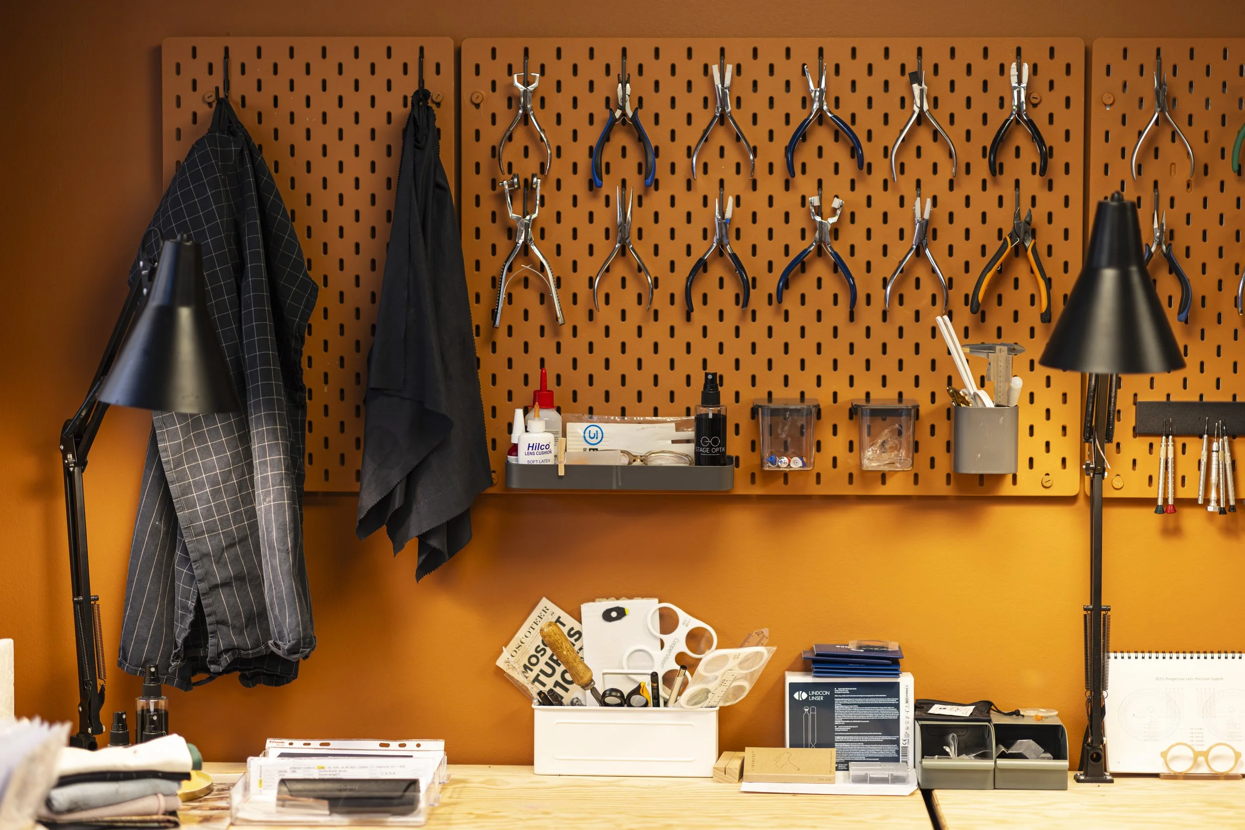The logo combines the ‘e’ from stage and the ‘o’ from optics, connected by a wire to form a subtle pair of glasses. The warm orange, black and blue tones are inspired by Charlotte’s beautiful, open workstation.